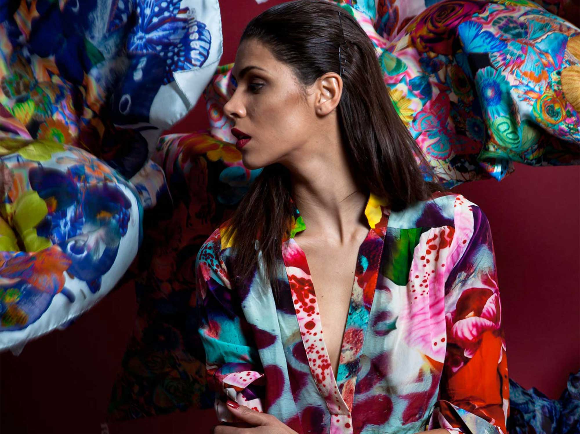 Utilizziamo tessuti naturali come vari tipi di seta, chiffon, twille, creponne, cashmere e modal.